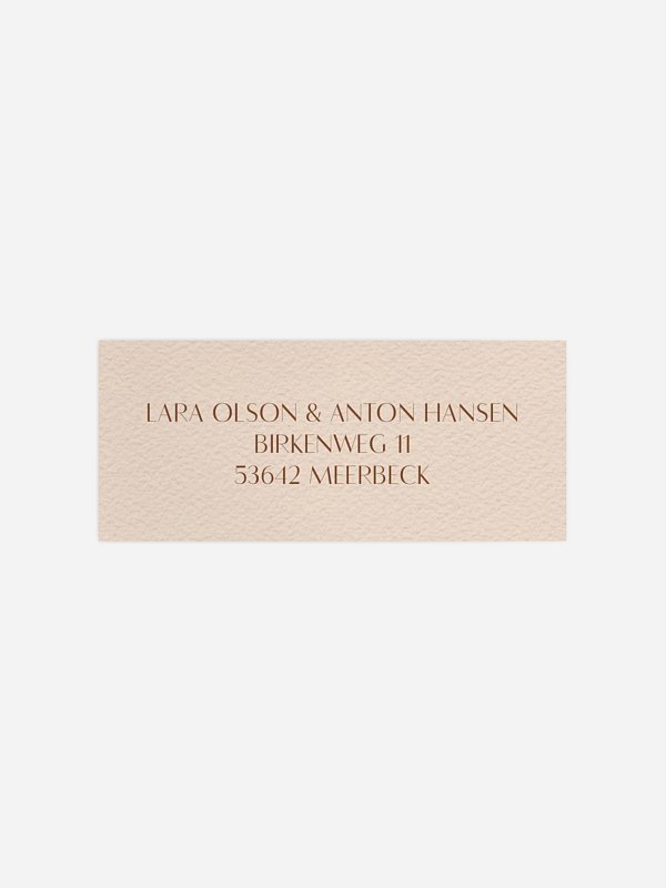Gestalten Sie die selbstklebenden Absenderaufkleber "Monogram muse" mit Ihrer eigenen Adresse. So sind Ihre Umschläge nicht nur praktisch beschriftet, sondern auch optisch perfekt abgerundet zu Ihrer Hochzeitseinladung
