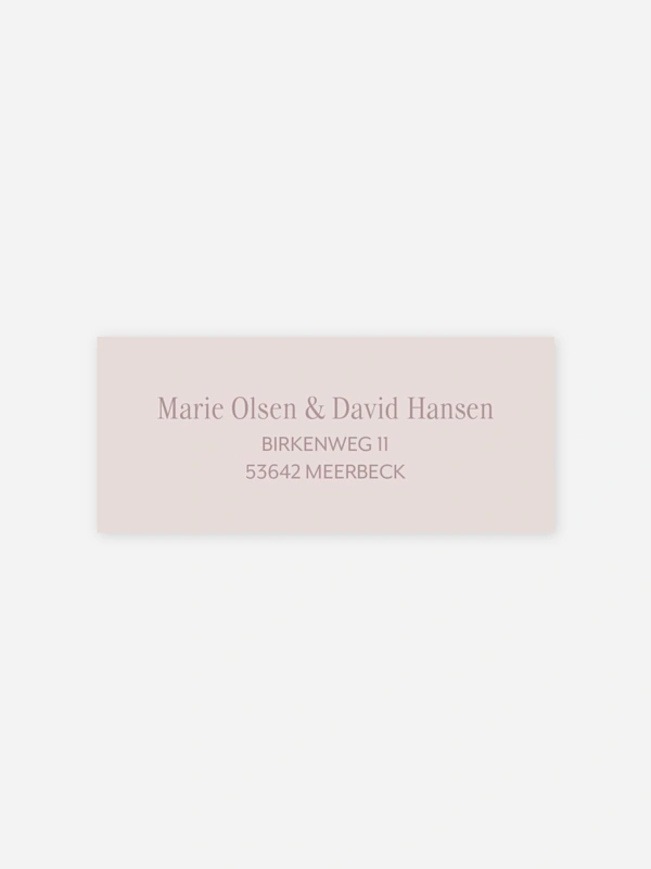 Gestalten Sie die selbstklebenden Absenderaufkleber "Synergie" mit Ihrer eigenen Adresse. So sind Ihre Umschläge nicht nur praktisch beschriftet, sondern auch optisch perfekt abgerundet zu Ihrer Hochzeitseinladung