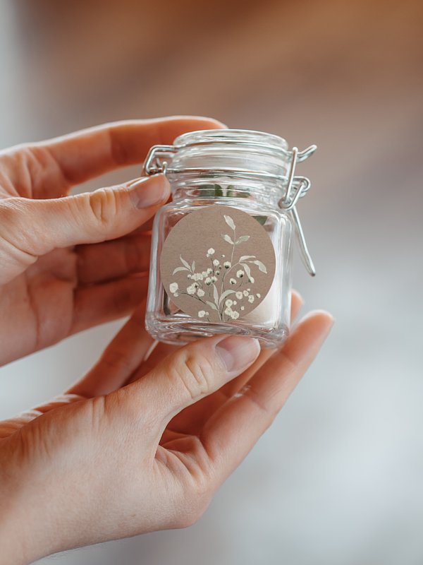 Personalisieren Sie die Hochzeitssticker "Love in Bloom" mit Ihren Namen und verschönern Sie damit die Gastgeschenke für Ihre Lieben.