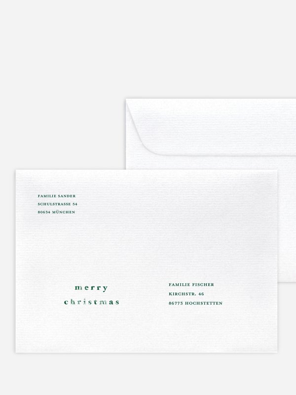 Machen Sie den Versand Ihrer Briefe und Karten so einfach und stilvoll wie nie zuvor mit unseren bedruckten, personalisierbaren Umschlägen. Diese eleganten Umschläge sind nicht nur eine perfekte Ergänzung zu unserer gesamten Designserie "Vintage Tanne", sondern auch eine praktische Lösung, um Ihre Postsendungen aufzuwerten.