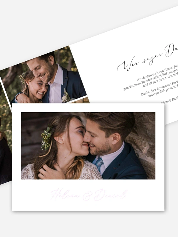 Mit der Hochzeitsdankeskarte "Herzensort" schenkt ihr euren Liebsten eine bleibende Erinnerung an euren großen Tag. Das reduzierte Design lässt eurem schönsten Paarfoto viel Raum, um die Emotionen eurer Hochzeit zur Geltung zu bringen. In unserem Gestaltungs-Tool könnt ihr eure Danksagungen nach der Hochzeit ganz einfach konfigurieren und so eure Dankbarkeit mit einer persönlichen Note ausdrücken. Wir sorgen mit hochwertigen Papieren dafür, dass eure Grüße so echt und herzlich wirken wie euer Ja-Wort.