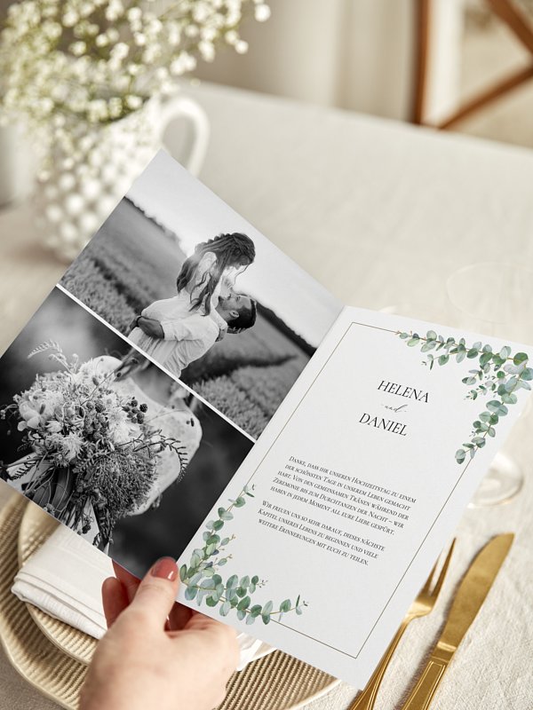 - Innenseiten: 1 Doppelseite für das Brautpaar, 2 unterschiedliche Doppelseiten für die Hochzeitsgäste, für Hochzeitspaare jeden Geschlechts geeignet.