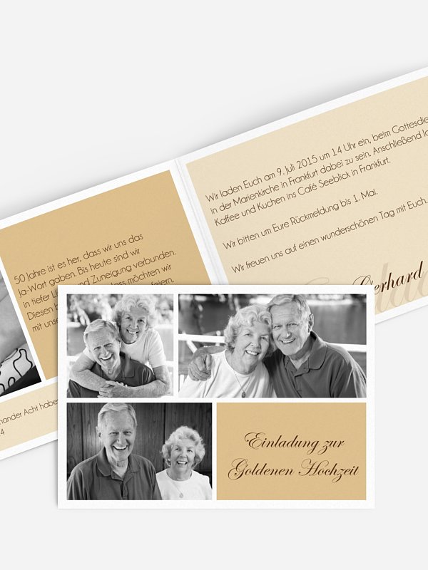 50 Jahre Ehe müssen gefeiert werden! Die Einladungskarte "Fotowand" lädt Ihre Gäste mit Ihren persönlichen Impressionen zur Goldenen Hochzeit ein.