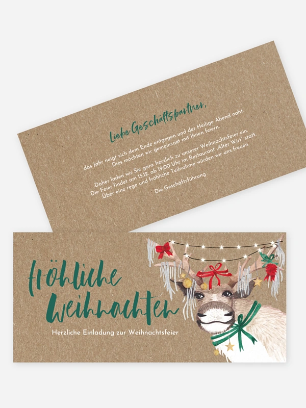 Der sorgfältig von Hand gezeichnete Hirsch versetzt Ihre Kunden und Geschäftspartner beim Anblick der edlen Karte "Christ-Mess Reindeer Kraftpapier" in wunderbar festliche Stimmung für ihre bevorstehende Weihnachtsfeier.