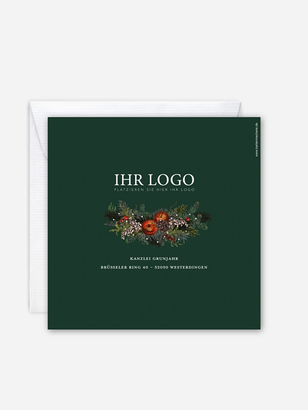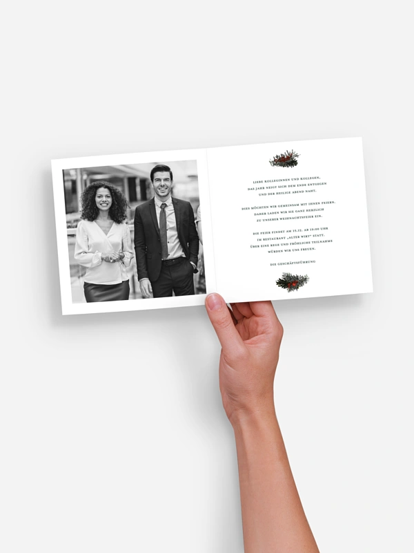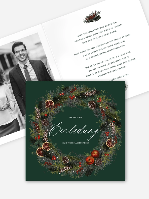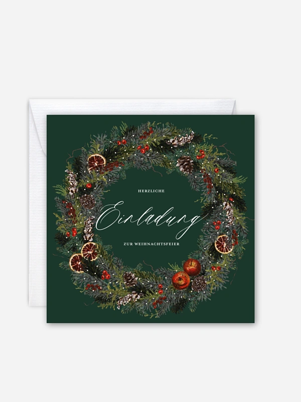 Grüntöne und natürliche Elemente machen die Einladungskarte "Festive" besonders. Die handgezeichneten Illustrationen stimmen dabei stilvoll auf die Weihnachtszeit ein.