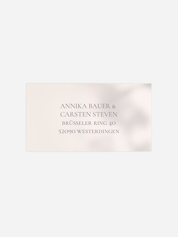 Personalisieren Sie die selbstklebenden Empfängeraufkleber "Komorebi" mit den Adressen Ihrer Gäste und bringen Sie sie direkt auf den Umschlägen an – schnell, ordentlich und stilvoll.