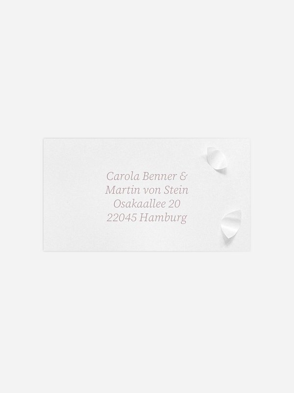 Personalisieren Sie die selbstklebenden Empfängeraufkleber "Poem on Paper" mit den Adressen Ihrer Gäste und bringen Sie sie direkt auf den Umschlägen an – schnell, ordentlich und stilvoll.