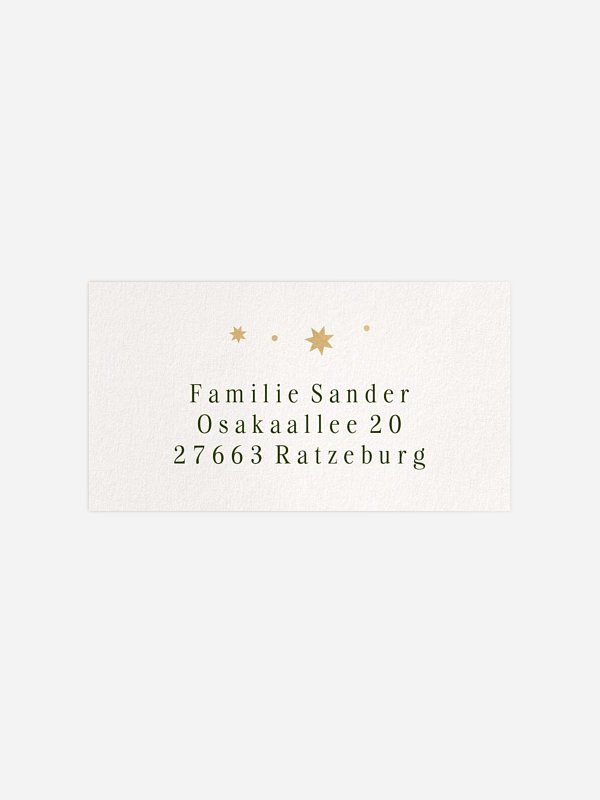 Gestalten Sie Ihre Postsendungen stilvoll und mühelos mit unseren personalisierbaren Empfängeraufklebern "Weihnachtliche Sterne"! Diese hochwertigen Aufkleber sind die perfekte Ergänzung zu unserer exklusiven Designserie und erleichtern Ihnen das Versenden von Briefen und Karten, indem sie das manuelle Beschriften per Hand überflüssig machen.