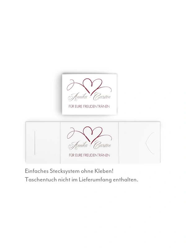 Schaffen Sie einen romantischen Rahmen für bewegende Glücksmomente mit den Banderolen "Herzschlag" für Ihre Freudentränen-Taschentücher.