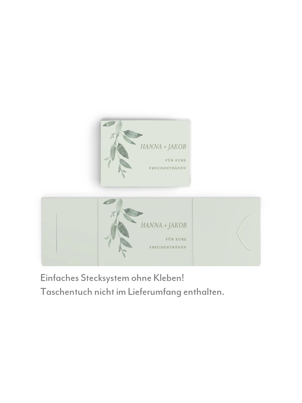 Für die Freudentränen bei der Trauung – die schönen Taschentücher-Banderolen im Design "Lovely Sage".