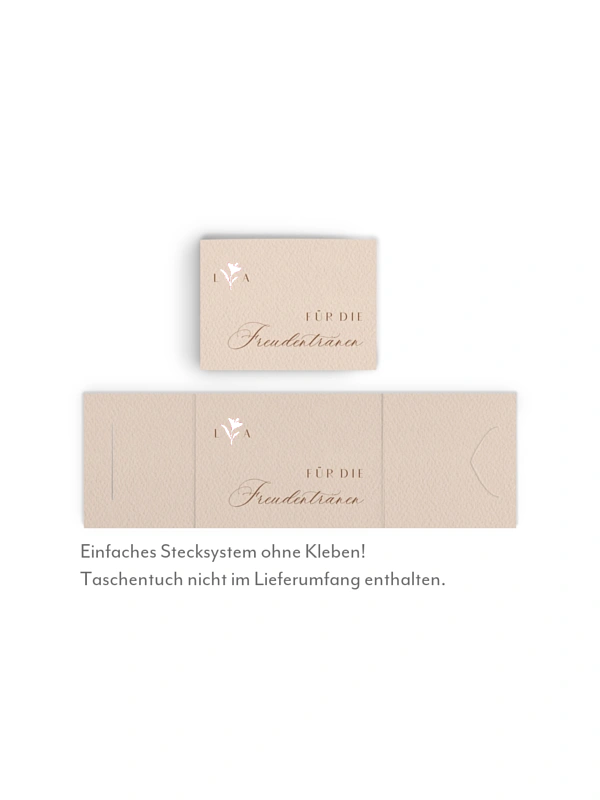 Gestalten Sie die hübschen Taschentuchhüllen "Monogram muse" individuell – perfekt für Freudentränen und kleine emotionale Momente während Ihrer Zeremonie.