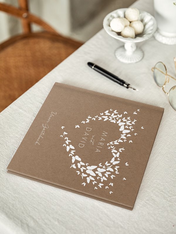 Lassen Sie Ihre Gäste die Seiten des Buches "Herzflattern" mit Wünschen und Gratulationen füllen.