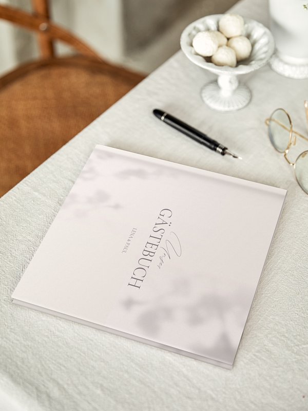 Bewahren Sie bleibende Erinnerungen an Ihren großen Tag mit dem Gästebuch "Komorebi". Ihre Gäste können persönliche Worte, Zeichnungen oder Fotos hinterlassen. Hinweise: Die Seiten sind weiß und glatt – ideal für Stifte, Marker oder Filzstifte ohne Durchdruck. Farben und Motive entsprechen der Darstellung im Gestaltungstool. Spitze oder Spitzeffekte sind rein gedruckt. Das Gästebuch wird separat verschickt.