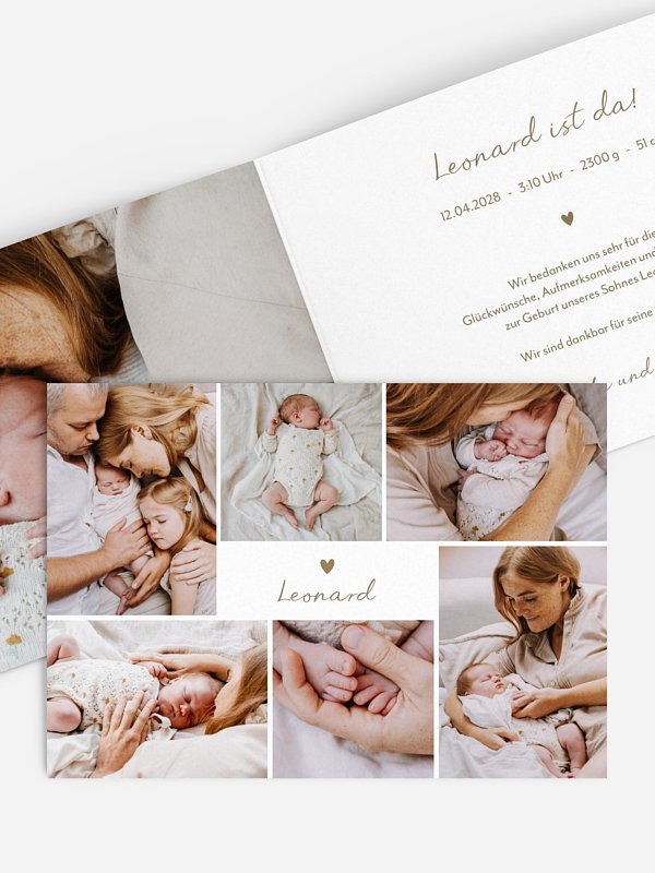 Für alle, die sich bei all den zauberhaften Fotos ihres Babys nicht entscheiden können. Auf diesem Design der Geburtskarte "Beautiful Day" haben extra viele Bilder Platz.