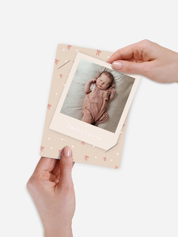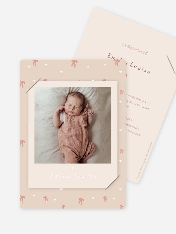 Entdeckt die süßeste Kooperation des Jahres! Wenn die zauberhaften Designs der dänischen Baby-Marke Cam Cam Copenhagen auf unsere liebevoll gestalteten Geburtskarten treffen, entsteht etwas ganz Besonderes für euren unvergesslichen Moment. Das moderne Design "Bows 1" mit seinen liebevollen, verspielten Details setzt das erste große Foto eures Schatzes wunderschön in Szene. So könnt ihr die Nachricht von der Geburt eures Babys auf eine stilvolle und persönliche Weise mit euren Liebsten teilen. Wir sorgen mit unserer hochwertigen Druckqualität und schnellen Lieferung dafür, dass ihr eure Karten schon bald voller Stolz in den Händen halten könnt.