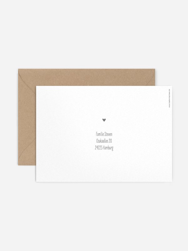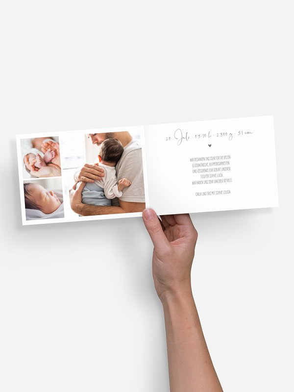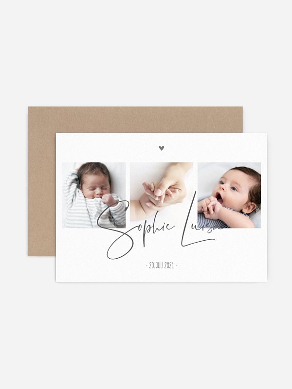 Ein kleines Herz macht die schlichte Geburtskarte "Glücksfotos" zu einem echten Hingucker. Hier stehen der Name und die schönsten Bilder Ihres Babys im Vordergrund! Auf den Innenseiten ist besonders viel Platz, um persönliche Dankesworte mit Ihren Liebsten zu teilen.