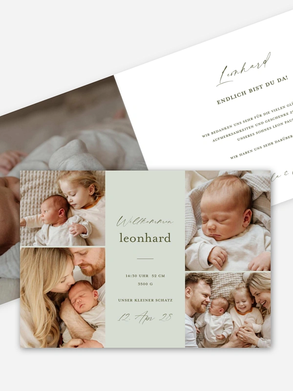Für alle, die sich bei all den zauberhaften Fotos ihres Babys nicht entscheiden können. Auf diesem Design der Geburtskarte "Herzmoment" haben extra viele Bilder Platz.