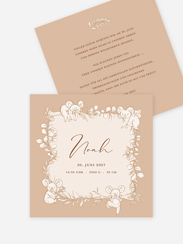 Fast so entzückend wie Ihr Baby: Unsere Geburtskarte "Koalas" verzaubert mit handgezeichneten Details und aufwendig gestalteten Designelementen.