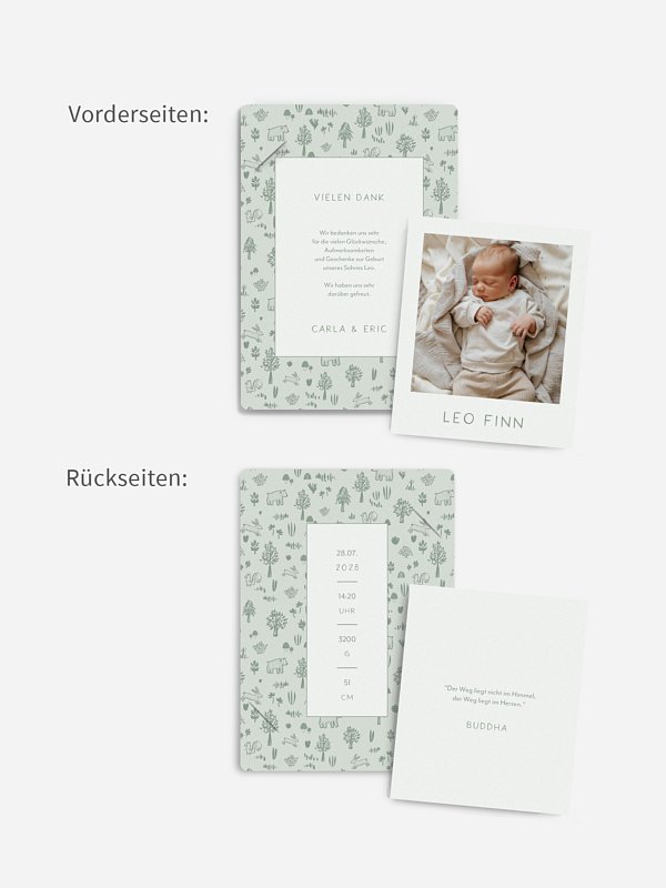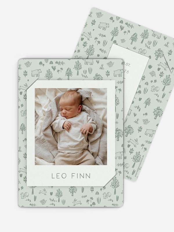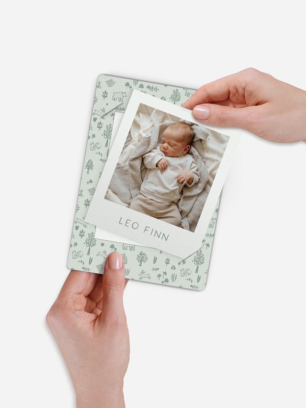 Die Geburtskarte "Little Forest" bringt die zauberhafte Ankunft deines Babys auf liebevolle Weise zum Ausdruck. Mit ihrem zarten, naturverbundenen Design schafft sie eine warme Verbindung zwischen deinem kleinen Wunder und euren Liebsten. So wird das erste Foto deines Babys zu einem ganz besonderen Gruß, den ihr voller Freude verschicken könnt. Dank hochwertiger Papiere und der Möglichkeit einer kostenlosen Musterkarte gestaltest du dein Lieblingsstück ganz entspannt online.
