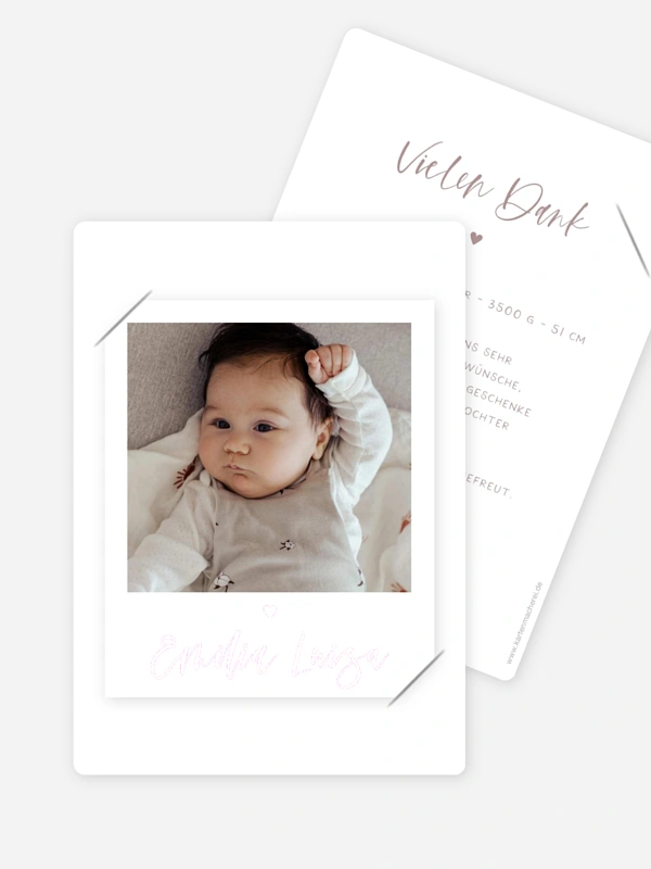 Zurückhaltend eingesetzte Designelemente rücken auf der Geburtskarte "Lovely Blessing" die süßesten Fotos Ihres Babys auf stilvolle Weise in den Vordergrund.