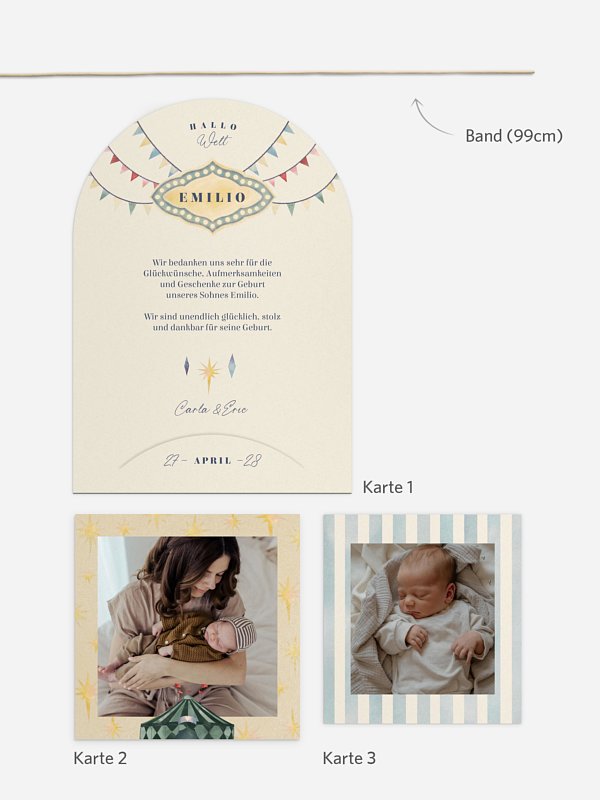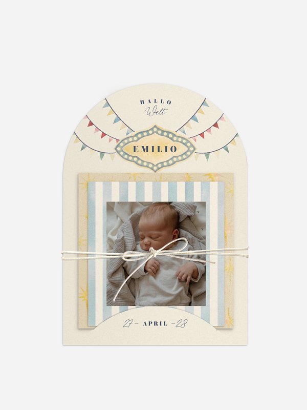 Mit der Geburtskarte „Manege frei“ begrüßt du dein kleines Wunder mit einem Augenzwinkern und viel Herz. Die fröhlichen Details lassen sofort ein Gefühl von Leichtigkeit entstehen und machen deine Botschaft an Familie und Freund:innen zu etwas ganz Besonderem. Dank hochwertiger Papiere und schneller Lieferung wird aus deiner Ankündigung ein Erinnerungsstück, das bleibt. Auf Wunsch kannst du dir vorab eine kostenlose Musterkarte bestellen – so gestaltest du in Ruhe dein perfektes Set.