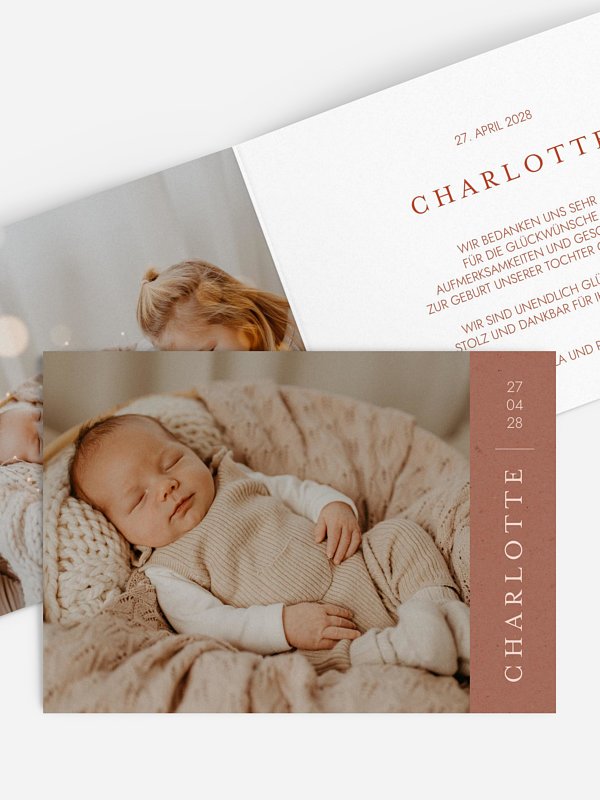 Teilen Sie ihr Glück mit Freunden und Verwandten! Die Geburtskarte "Sanfter Anfang" bietet Platz für ein großes Foto Ihres Babys und setzt dieses gekonnt in Szene.