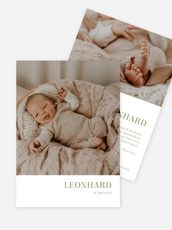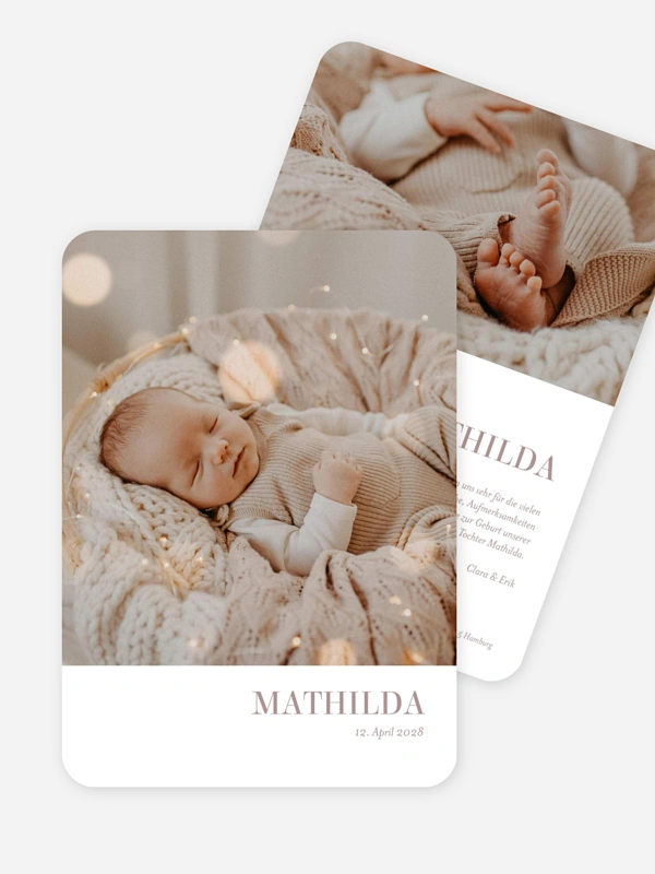 Was für ein schöner Moment, um euer kleines Glück mit der Welt zu teilen. Unsere Geburtskarte "Schlichtes Wunder" rückt euer liebstes Foto ganz sanft in den Mittelpunkt und lässt viel Raum für die ersten Details eures Schatzes.