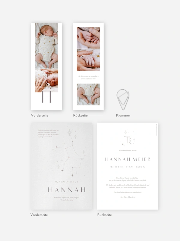 Mit der Geburtskarte "Sternbild Jungfrau" kündigst du die Ankunft deines Babys auf eine ganz besondere Weise an. Das liebevolle Design mit passendem Sternzeichenmotiv verbindet Himmel und Herz und macht deine Botschaft zu einem kleinen Wunder zum Verschicken. Hochwertige Papiere und brillante Druckqualität sorgen dafür, dass deine Karte so schön bleibt wie der Moment selbst. Auf Wunsch erhältst du eine kostenlose Musterkarte, damit du dein Design in Ruhe anschauen kannst.