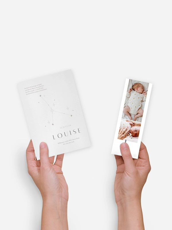 Mit der Geburtskarte "Sternbild Krebs" kündigst du die Ankunft deines Babys auf eine ganz besondere Weise an. Das liebevolle Design mit passendem Sternzeichenmotiv verbindet Himmel und Herz und macht deine Botschaft zu einem kleinen Wunder zum Verschicken. Hochwertige Papiere und brillante Druckqualität sorgen dafür, dass deine Karte so schön bleibt wie der Moment selbst. Auf Wunsch erhältst du eine kostenlose Musterkarte, damit du dein Design in Ruhe anschauen kannst.