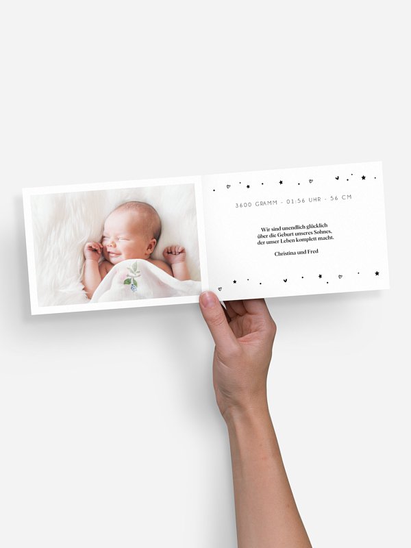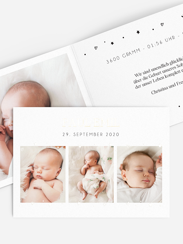 Die Geburtskarte "Sternlein" verzaubert mit kleinen Sternchen und Herzchen. Als dezente Details umspielen diese die Bilder und Innenseiten der Karte und können auf den Außenseiten auch in Heißfolien-Optik gedruckt werden und so metallisch schimmern.