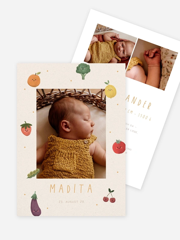 Mit der Geburtskarte "Vitamin Glück“ bringst du die Freude über dein Baby direkt zu deinen Liebsten. Dein Foto, umrahmt von fröhlichen Illustrationen, erzählt die schönste Geschichte – nahbar, herzlich und voller Wärme. So wird deine Geburtsanzeige zu einer kleinen Umarmung auf Papier.