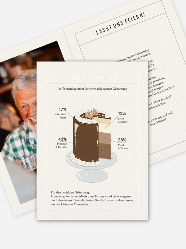 Die Einladung 70. Geburtstag "Birthday Chart" bringt auf den Punkt, was diesen Tag ausmacht. Sie zeigt, wie sich ein runder Geburtstag anfühlt: gemeinsam lachen, gut essen, tanzen und einfach zusammen sein. Deine Einladung zum Geburtstag wird so zu einer kleinen Vorschau auf das Fest selbst. Gestalten kannst du sie ganz unkompliziert im Gestaltungs-Tool – damit am Ende alles stimmig ist, vom ersten Eindruck bis zum großen Tag.