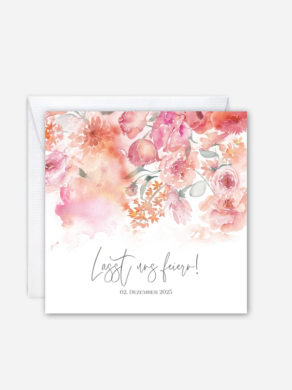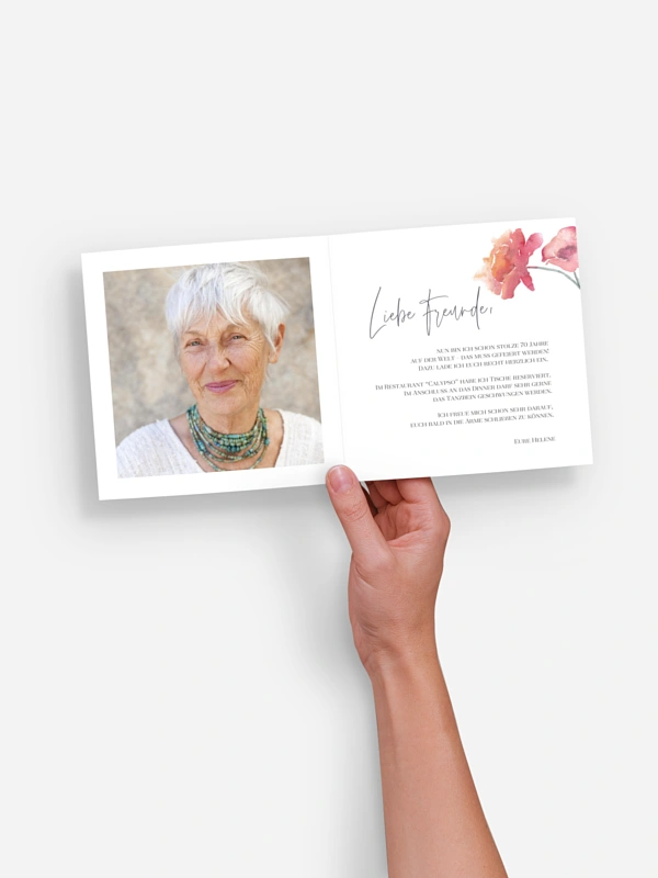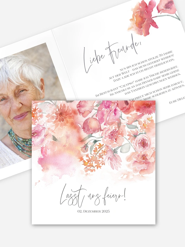 Lassen Sie Blumen sprechen: Die Karte "Blütentanz" besticht mit wundervollen floralen Elementen und lädt somit auf stilvolle Weise zu Ihrem Geburtstagsfest ein.