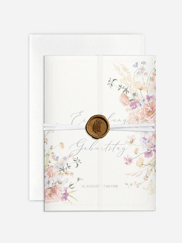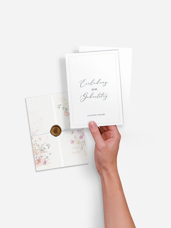 Blumig, zart und edel: Die Einladungskarte "Daphne" begeistert mit aufwendig gezeichneten Blüten und genug Platz für Ihr schönstes Foto.