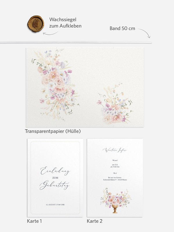 - Hülle: 120x171mm (geschlossen), Postkarten: 120x170mm, Band: 50cm, Wachssiegel: Ø 25mm