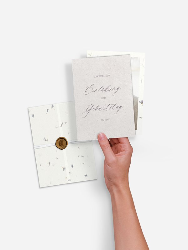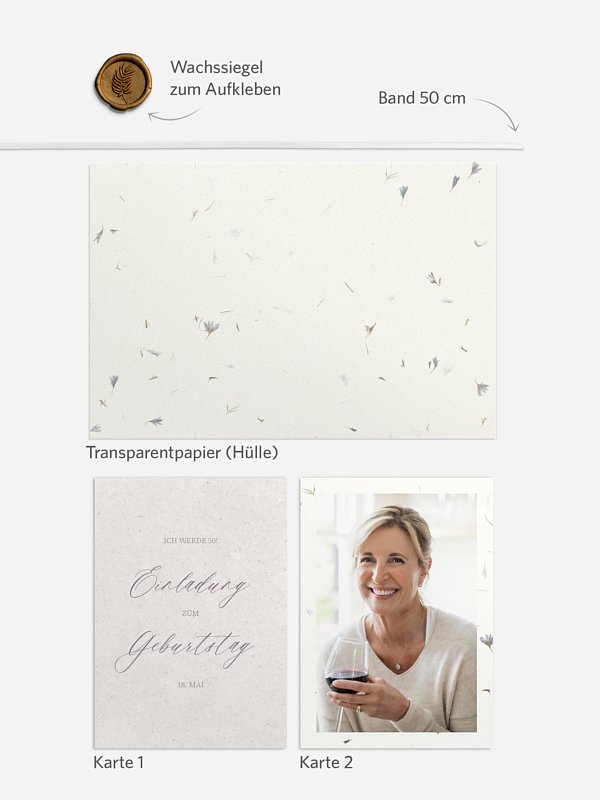- Hülle: 120x171mm (geschlossen), Postkarten: 120x170mm, Band: 50cm, Wachssiegel: Ø 25mm