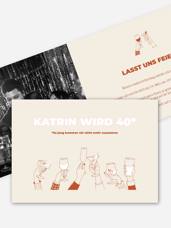 Mit der Geburtstagseinladung "Hoch die Gläser" lädst du deine Lieblingsmenschen zu einem ganz besonderen Moment ein. Die Einladung zum Geburtstag wirkt gesellig und persönlich – genau richtig, um gemeinsam anzustoßen und Erinnerungen zu sammeln. Du kannst deine Geburtstagseinladung gestalten, wie sie zu dir passt, ganz unkompliziert im Gestaltungs-Tool und mit schneller Lieferung zu dir nach Hause. So wird aus deiner Einladung ein schöner Auftakt für deinen großen Tag.