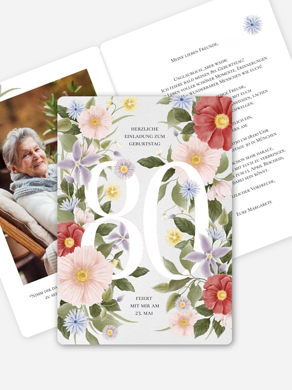 Mit der Einladung zum 80. Geburtstag "Klassische Romantik" lädst du deine Lieblingsmenschen auf eine Feier ein, die sich nach Nähe, Erinnerungen und einem Lächeln anfühlt. Zarte florale Illustrationen rahmen den großen Moment und geben der Einladung einen ruhigen, zeitlosen Charakter – genau richtig für einen besonderen Geburtstag. Die Geburtstagseinladung lässt sich ganz einfach im Gestaltungs-Tool personalisieren und wird auf hochwertigen Papieren für dich gedruckt. So entsteht eine Einladung, die zeigt, wie viel dir dieser Tag und die Menschen dahinter bedeuten.