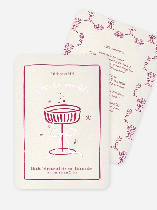 Mit der Geburtstagseinladung "Party Drink" stoßt ihr schon auf der Karte gemeinsam an und macht direkt Lust auf einen fröhlichen Abend. Das verspielte Motiv bringt Leichtigkeit und ein Augenzwinkern in deine Einladung zum Geburtstag – perfekt für alle, die das Leben feiern, wie es kommt. Du kannst die Geburtstagseinladung ganz einfach gestalten und im Gestaltungs-Tool mit wenigen Klicks persönlich machen. Gedruckt auf hochwertigen Papieren und schnell bei dir, ist sie bereit für viele glückliche Zusagen.
