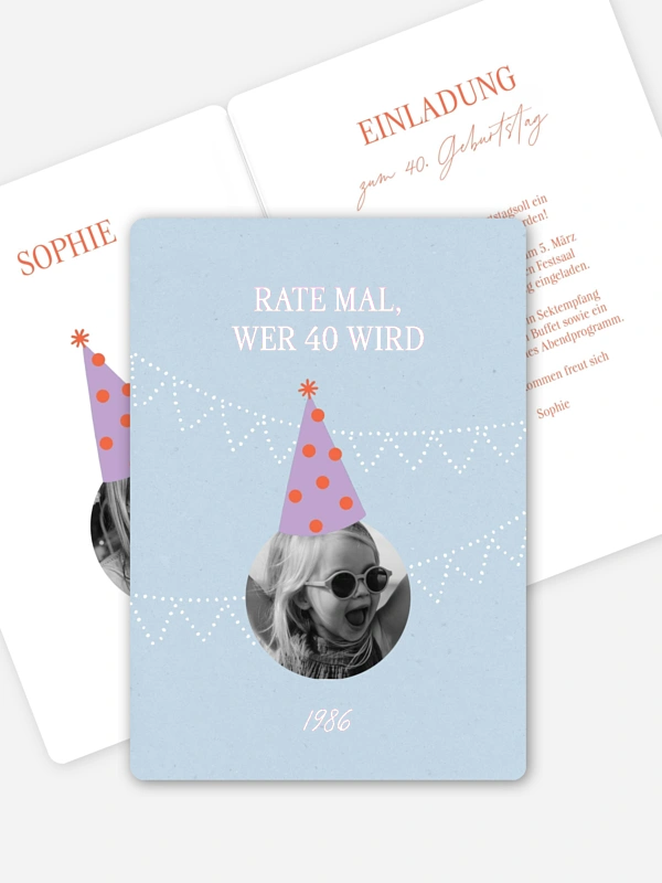Mit der Einladung zum 40. Geburtstag "Party-Hut" beginnt die Feier schon beim Öffnen des Umschlags. Das verspielte Design steckt voller Leichtigkeit und kleiner Augenzwinker-Momente – perfekt für einen Geburtstag, der mit Freude und guter Laune gefeiert wird. Die Geburtstagseinladung kannst du ganz unkompliziert im Gestaltungs-Tool personalisieren und nach deinen Wünschen anpassen. Gedruckt auf hochwertigen Papieren wird daraus der ideale Startschuss für einen Abend mit deinen Lieblingsmenschen.