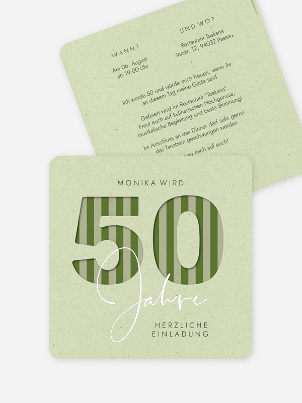 Die Einladung zum 50. Geburtstag "Simply Striped" feiert diesen besonderen Meilenstein mit ruhiger Eleganz und klarer Typografie. Sie gibt deinem Geburtstag genau den Raum, den er verdient, und lädt deine Lieblingsmensschen herzlich zum Mitfeiern ein. Als stilvolle Geburtstagseinladung lässt sie sich ganz einfach im Gestaltungs-Tool personalisieren und wird so schnell zu etwas ganz Eigenem. Hochwertig gedruckt und unkompliziert gestaltet, ist sie bereit für einen Moment, den ihr gemeinsam genießen könnt.