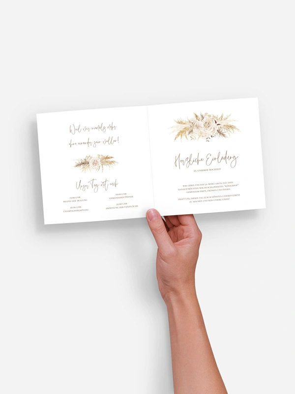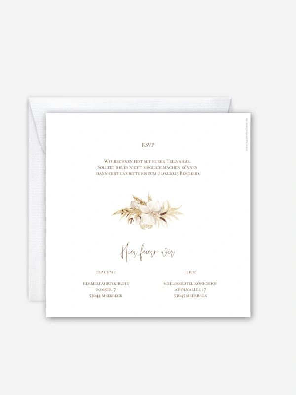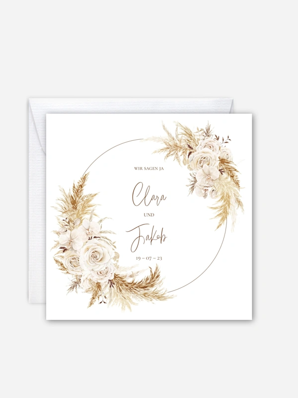 Handgemalte Gräser und Blüten bilden einen wunderschönen Kranz auf der Hochzeitseinladung "Elegant Boho".