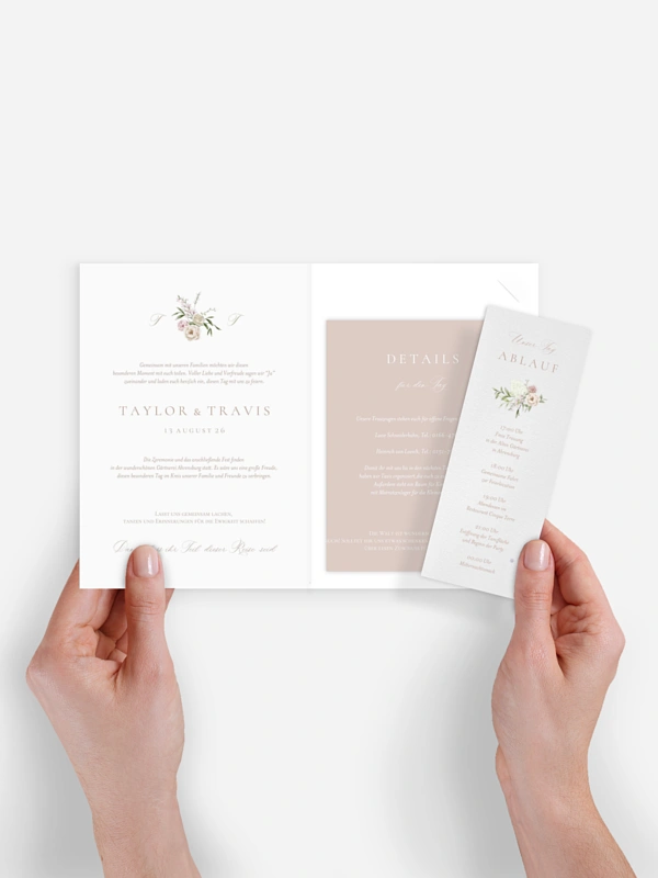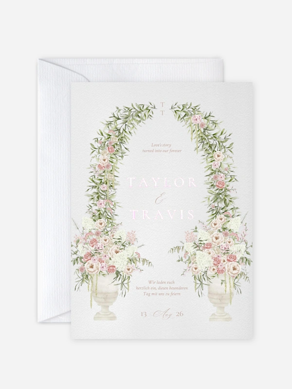 Die Hochzeitseinladung "Enchanted Garden" lädt eure Liebsten in ein romantisches Gartenmärchen ein. Verspielte Blüten und zarte Details machen sie zu einer besonders liebevollen Art, euren großen Tag anzukündigen. Sie strahlt festliche Eleganz aus und passt wunderbar zu einer Hochzeit im Grünen oder einer Feier voller floraler Akzente. Gedruckt auf hochwertigen Papieren und mit schneller Lieferung ist sie nicht nur schön, sondern auch praktisch für eure Planung.