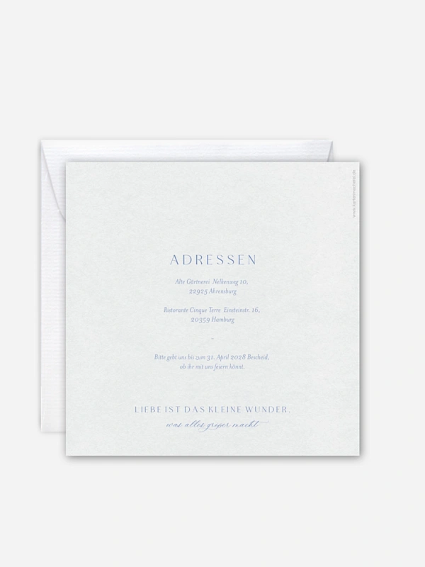 „Es war alles perfekt! Die Qualität der Karten und Umschläge ist erstklassig, das Druckbild hervorragend und der Service bestens.“ (Familie Hübner)