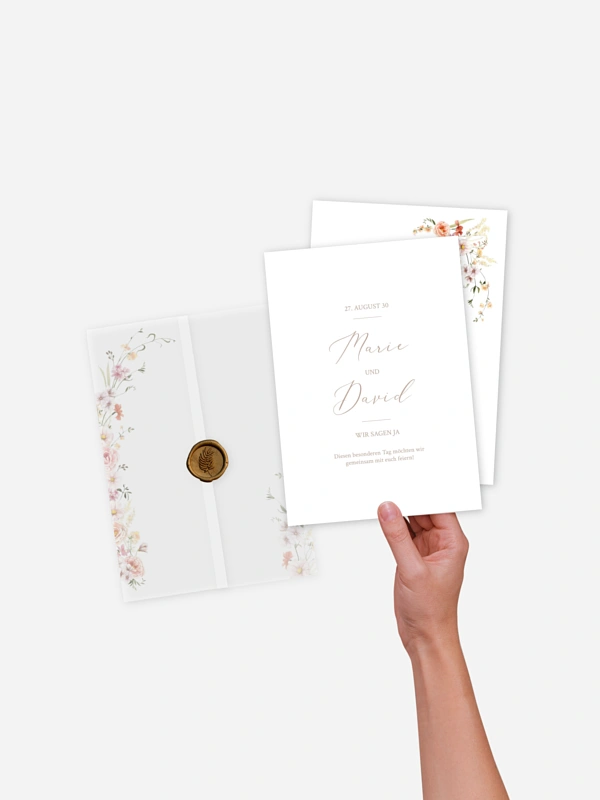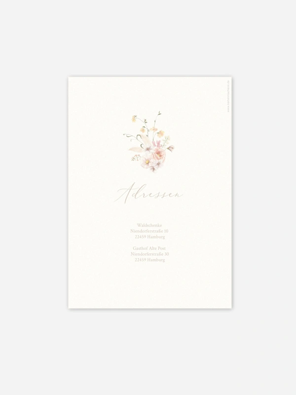 Zarte, wunderschöne Blüten umspielen Ihre Namen auf der Hochzeitseinladung "Flora".