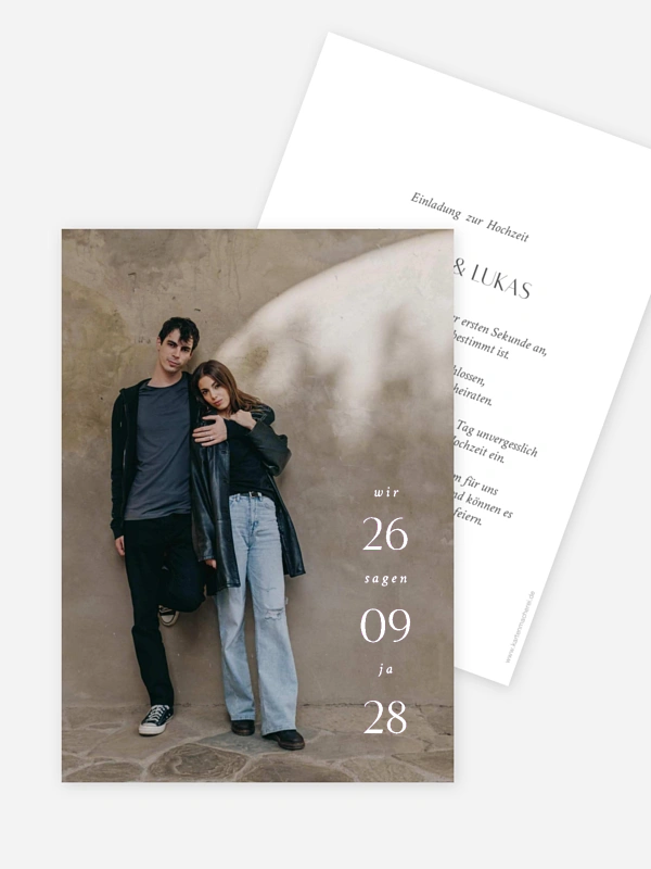 Mit der Hochzeitseinladung "Like A Movie" laden Sie Ihre Gäste modern und stilsicher zur Trauung ein. Im Vordergrund steht ein Foto von Ihnen und veredelte Highlights sorgen für das besondere Etwas!