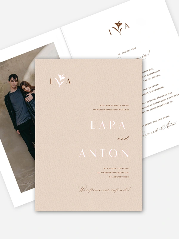 Die wunderschöne Hochzeitseinladung "Monogram muse" lädt Ihre Gäste besonders edel und modern ein.