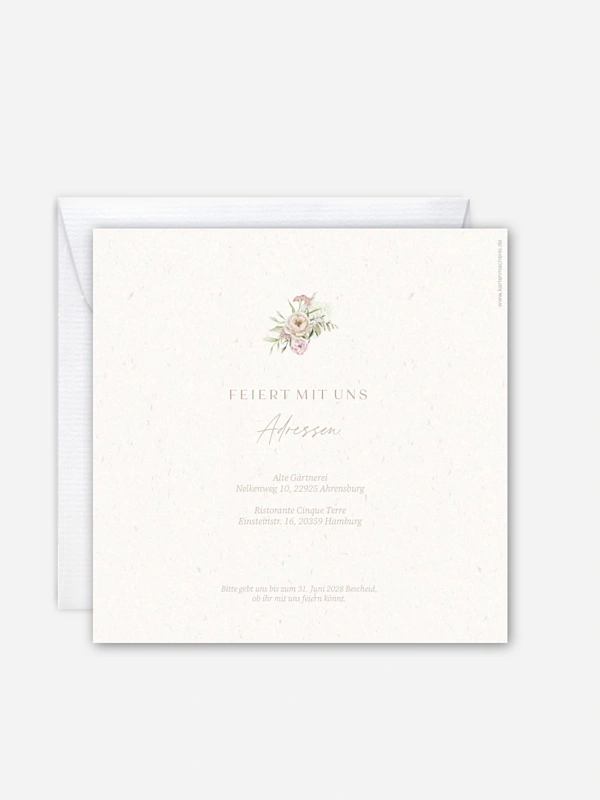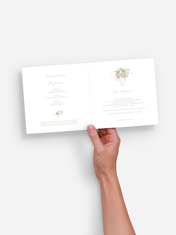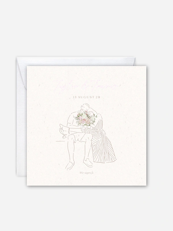 Die Hochzeitseinladung "Our Love Story" erzählt eure Geschichte auf eine wunderbar zarte und persönliche Weise. Das handgezeichnete Motiv und die floralen Akzente machen sie zu einer modernen und zugleich romantischen Einladung zur Hochzeit. Sie schafft eine warme Verbindung zwischen euch und euren Gästen und lädt liebevoll zu eurem großen Tag ein. Mit hochwertigen Papieren und schneller Lieferung wird sie zu einem besonderen Detail, das eure Feier stilvoll abrundet.