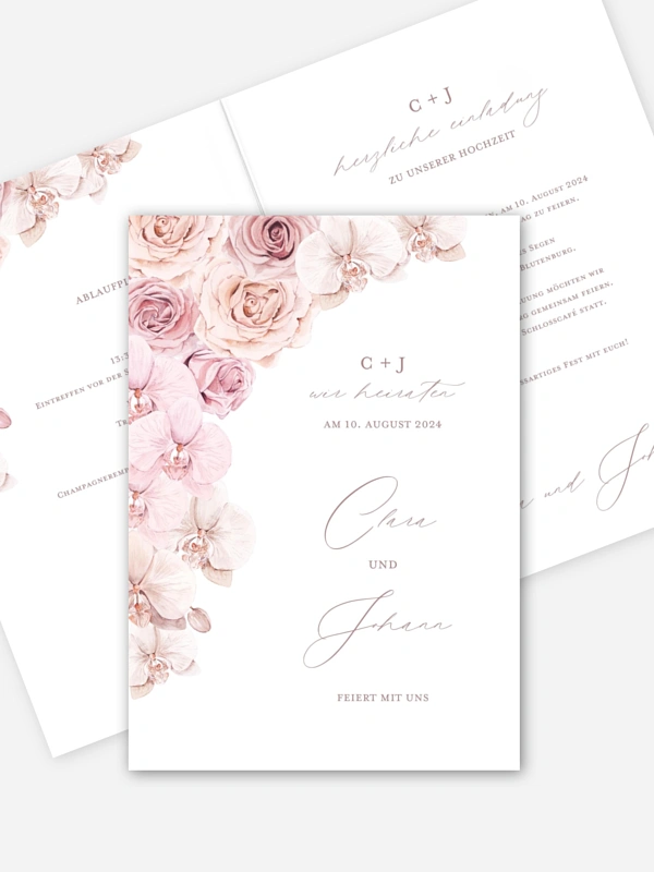 Aufwendig gemalte Orchideen und Rosen sind die Highlights auf der Hochzeitseinladung "Pink Orchid" – ein totales Trend-Design.