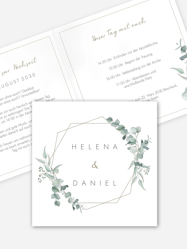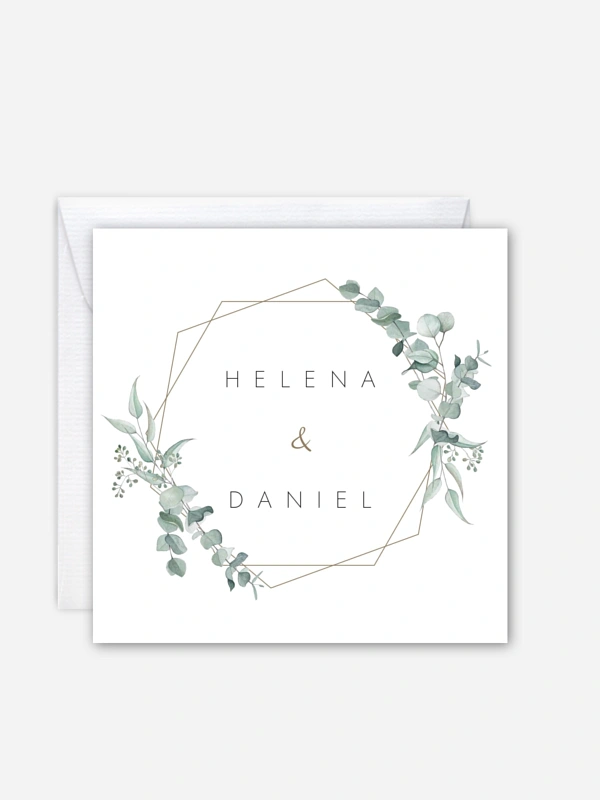 Modernes geometrisches Design ist genau Ihr Ding? Dann laden Sie zu Ihrer Hochzeit mit dem passendem Design "Soft Greenery" ein.
